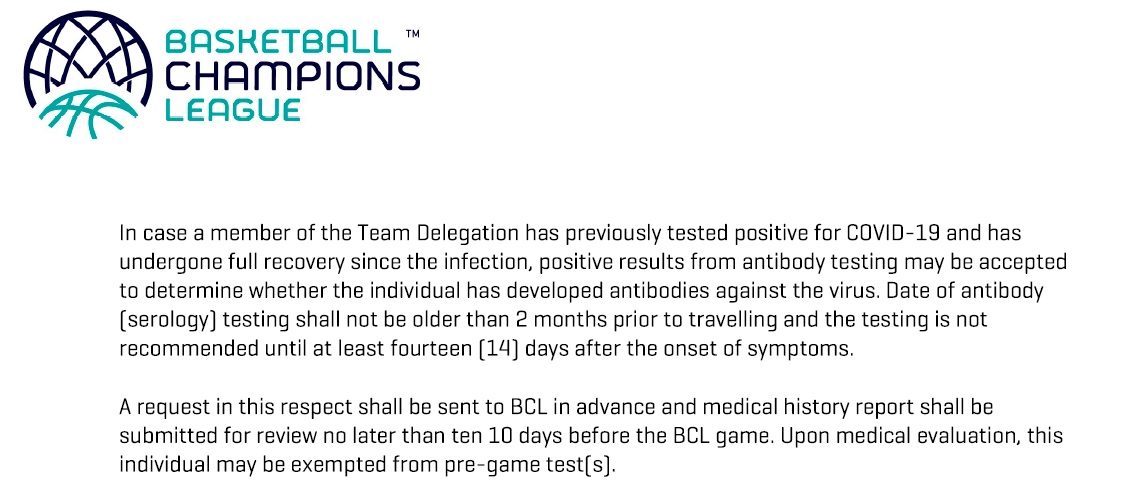Every game participant that wants to be exempted from PCR testing for a certain period has to provide BCL office with Antibody (serology) Test and the medical history of the infection and its rehabilitation process from a relevant doctor. BCL medical experts will proceed further with the evaluation of immunological status and, finally, will decide about the case on a one by one basis.