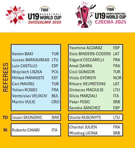The nominations for both FIBA U19 World Cups, Men and Women, 2025 have been published. 28 referees, 4 Technical Delegates and 4 Referee Instructors will participate in each event, with the Men's Champiosnhip to be played in Lausanne (SUI), while the Women's Championship will be played in Brno (CZE).